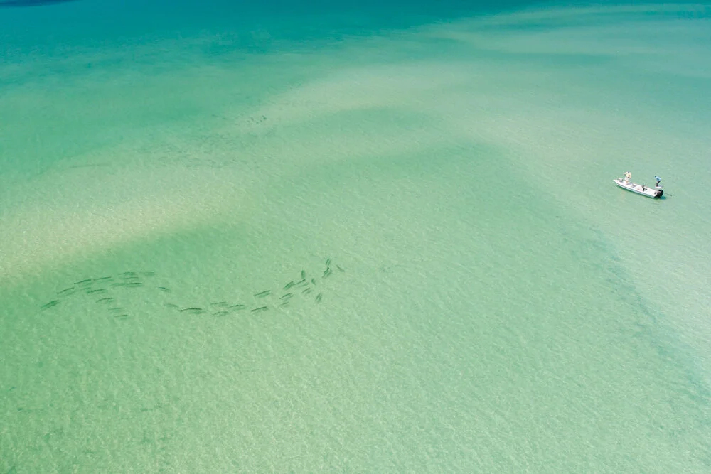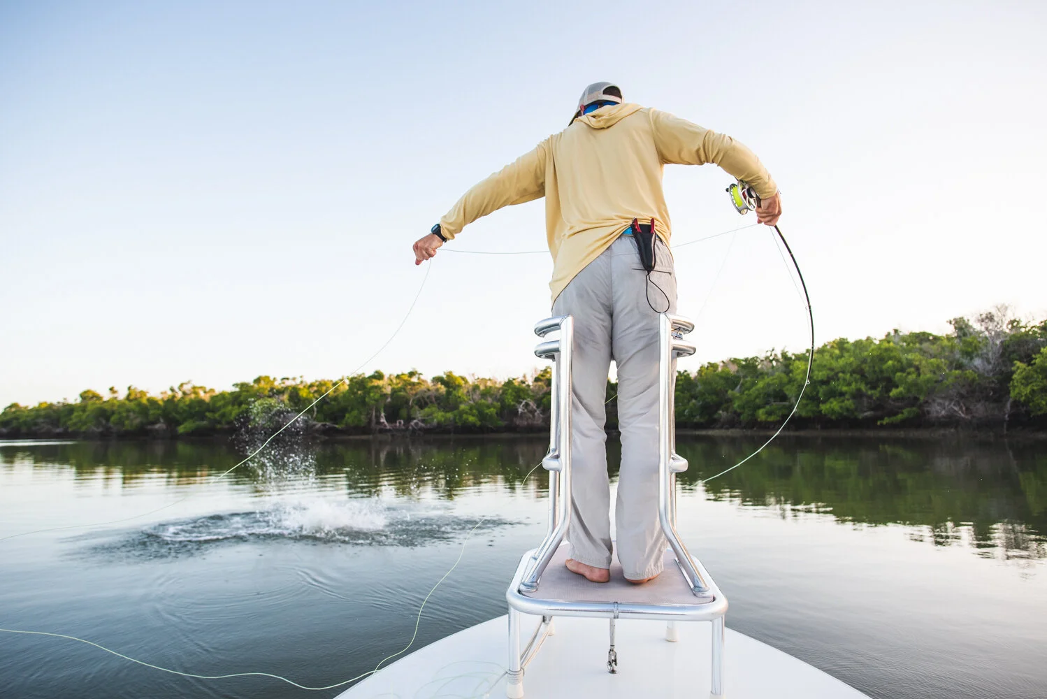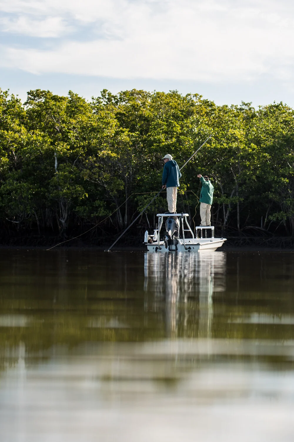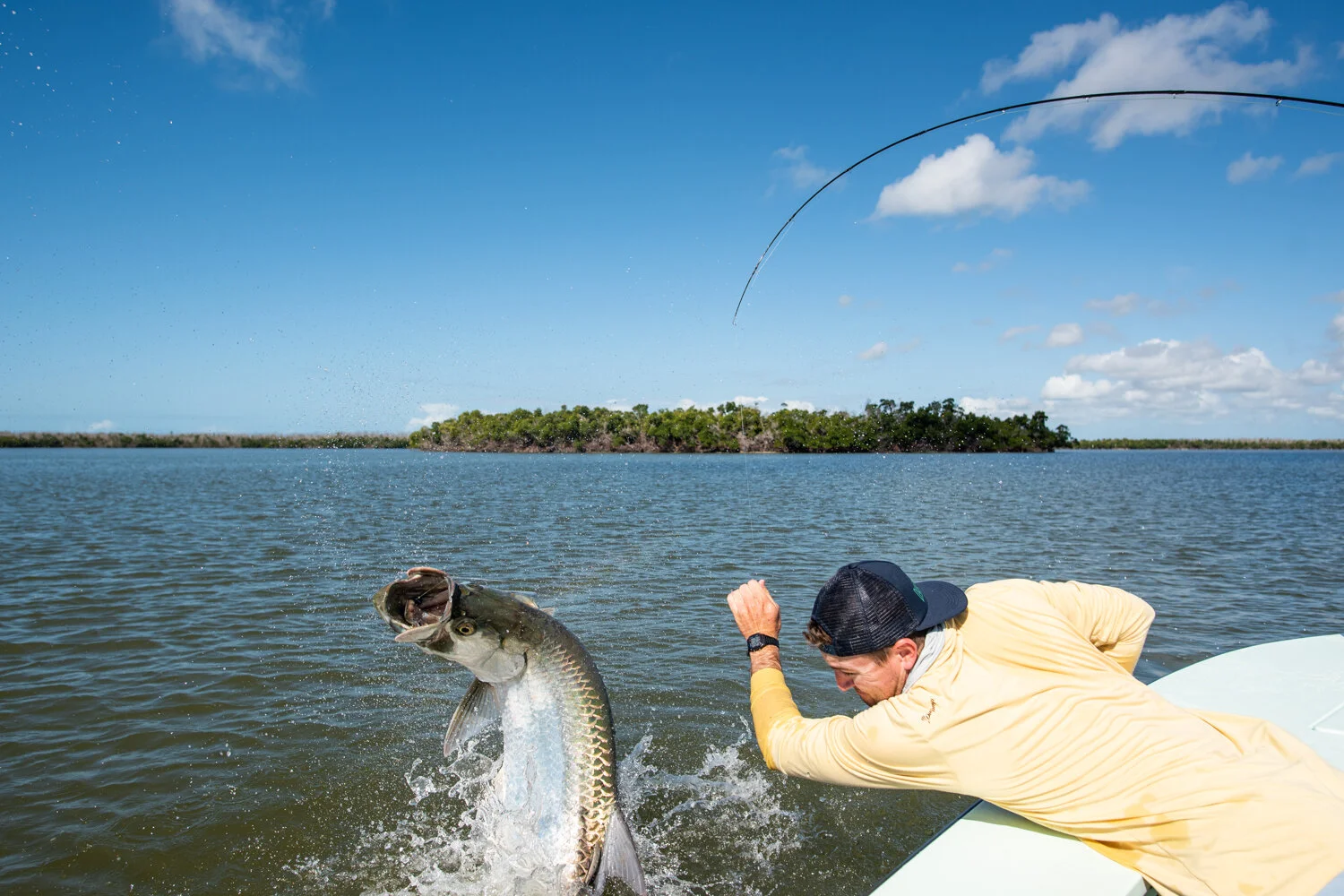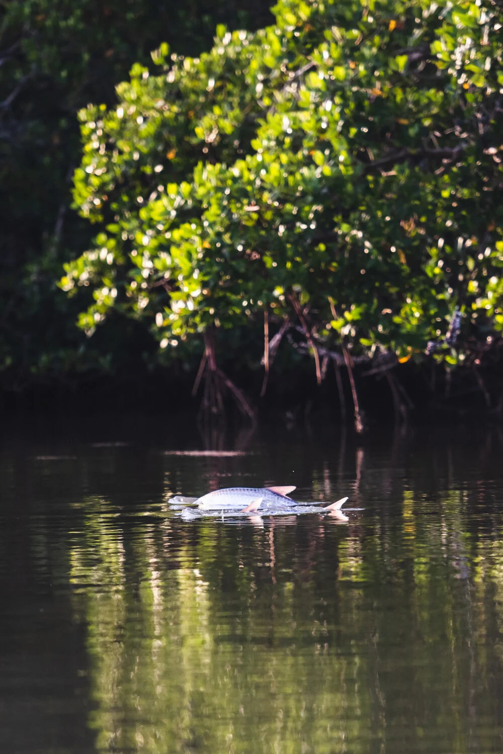 Driving south, on the Tamiami Trail, the patches of fog and stagnant air signal that’s its going to be a good tarpon day. There is a smell in the air during tarpon season that is humid, sweet, and salty all at the same time. Everything is lining up, the water temperature, air temperature, and weather. It is early April in Everglades City, just four days after a cold front, but the water is 75 degrees and warming by the minute. I know the fish have to be flowing into the bays right now. The push poles slides me quietly into a bay, as I scan looking for signs of life. Bloop, the distinct sound of a tarpon rolling. They’re here.
